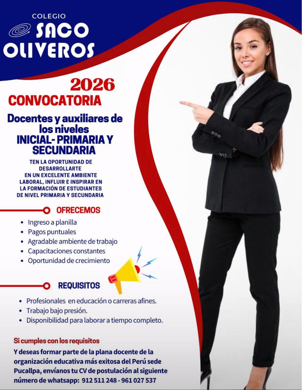 Si deseas formar parte de la plana docente de la organización educativa más exitosa del Perú sede Pucallpa, envíanos tu CV de postulación al siguiente número de whatsApp: 912511248 – 961027537